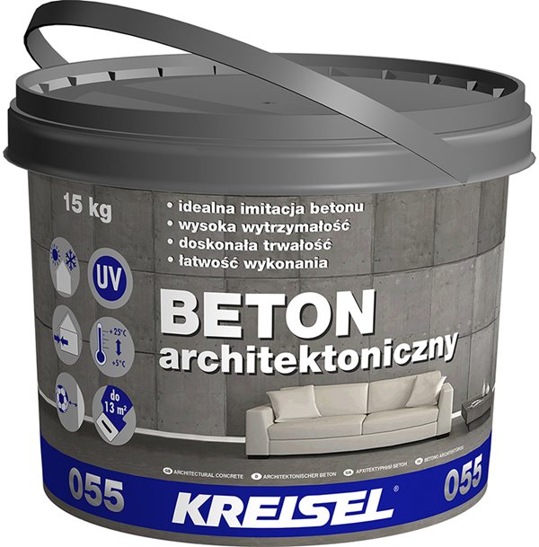 Beton architektoniczny 055 KREISEL: tynk w wielu kolorach, na elewacje i do wnętrz. Odporny na wodę, mróz i uderzenia. Idealny do stylizacji powierzchni na efekt betonu.